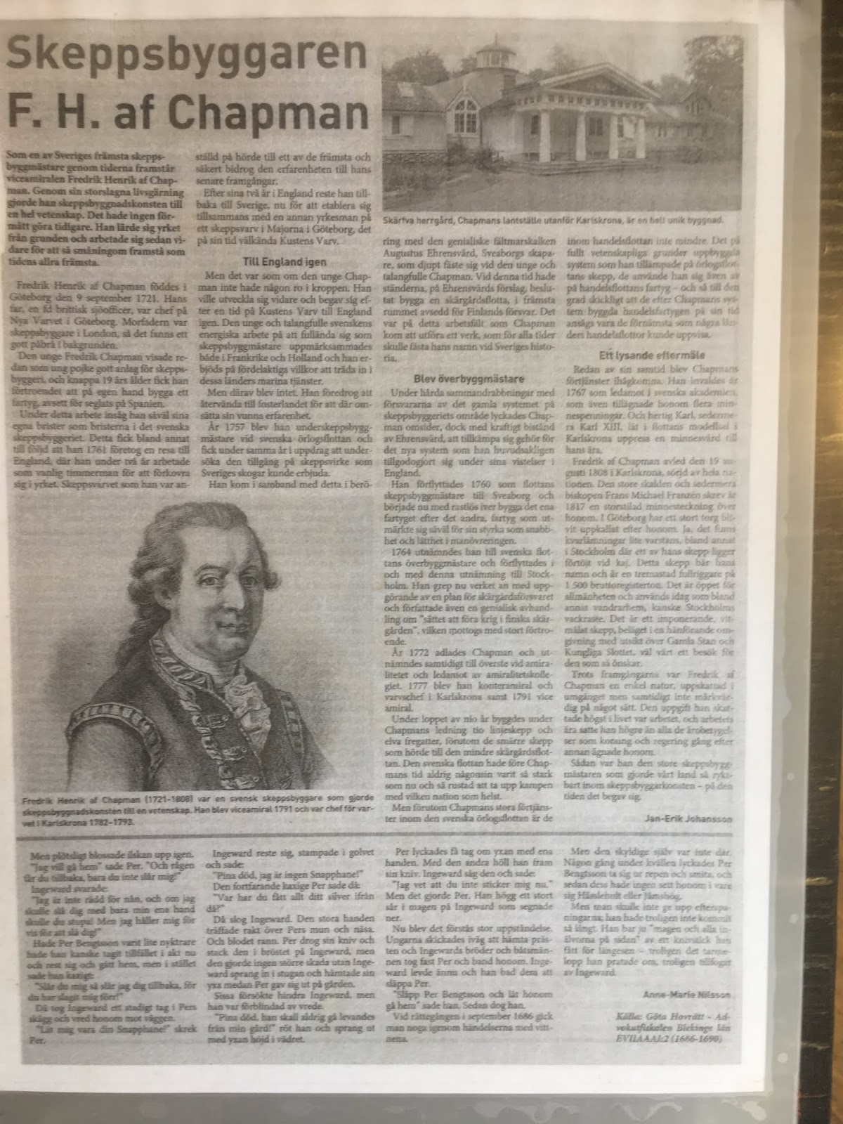 Zelf heb ik met veel interesse gekeken naar het opbouwen van de spanten van het nieuwe schip dat er op de werf wordt gebouwd. De Ångslup is nu klaar en het volgende exemplaar is de Fredrika af Capman. Een oud zeilschip met een prachtige spiegel (zie foto hieronder). De kielbalk is gelegd en nu staan er drie zijspanten gesteld.