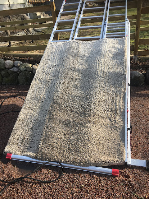 Weer thuis heb ik het wollen vloerkleed uit de hal gehaald om dit vandaag met de hogedrukspuit schoon de spuiten. Op de foto hieronder zie je het liggen. Zo met de hogedrukspuit vind ik een prachtige manier om de vloerkleden schoon te maken. Tot nu toe valt het me ook erg mee hoeveel tijd ermee gemoeid gaat voordat de kleden droog zijn. Dit kleed is wat dikker, dat zal ook wel ietsje lager duren, we zullen zien. Het kleed is erg opgeknapt en heeft nu de oorspronkelijke kleur weer terug.
